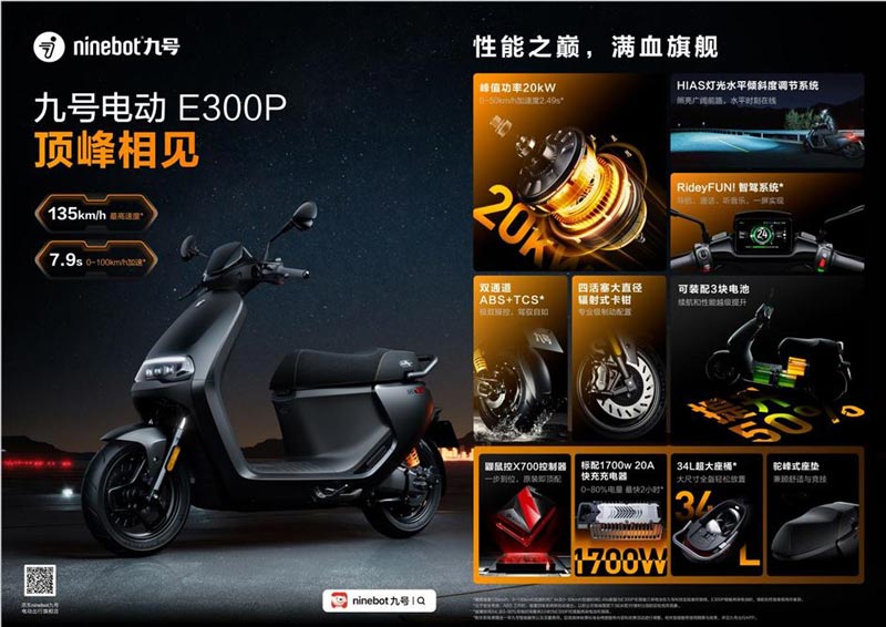 九號電動E300P可謂是全場焦點般的存在,作為一款主打高性能的智能電摩,實現(xiàn)了可搭載三塊電池的新突破,整車的性能和續(xù)航都有一個大幅度的提升:峰值功率為20kW,最 高速度可達135km/h,0-100km/h加速時間可達7.9s,以強勁的性能,刷新世人對性能的看法。
