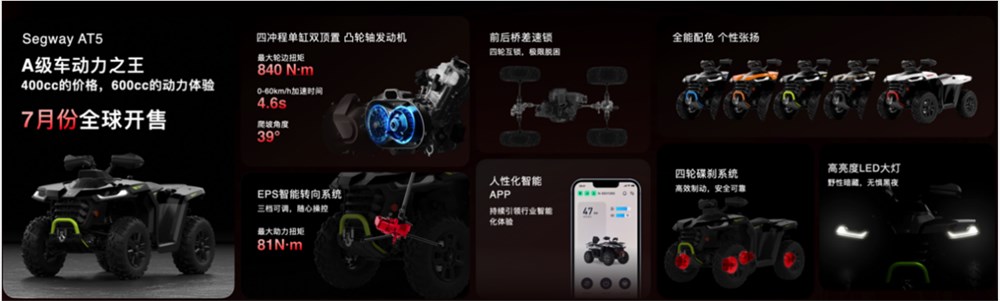 這款被譽為“A級車動力王”的 Segway AT5 全地形車,在發(fā)布會上大放異彩。它擁有強勁的動力和卓越的配置,600cc的動力搭配400cc的售價,為駕車者帶來了更加震撼的越野感和更具心動的價格。Segway AT5 采用的是全自主研發(fā)的四沖程單缸雙頂置凸輪軸發(fā)動機,其最 高速度為100km/h,最 大車輪轉矩為840N·m,0-60km/h的加速時間只需要4. 6 秒,這樣強勁的動力性能使得它的駕駛員能夠在任何復雜的地形中暢通無阻。