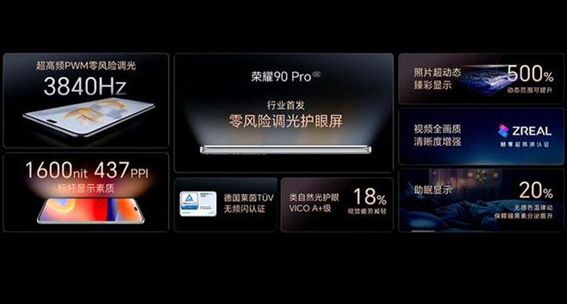 榮耀90系列帶來了2億像素寫真人像相機,行業領先的3840Hz PWM零風險調光護眼屏,5000mAh超大電池+90W超級快充,全新MagicOS 7.1智慧體驗等突破式升級,力求給用戶帶來全新體驗。2億像素超清大底主攝,1200萬像素超廣角微距鏡頭,3200萬像素長焦人像鏡頭,這些強悍的影像硬件使得消費者能輕松拍出單反風格的寫真人像;采用3840Hz超高頻PWM調光,打造零風險調光級別的手機OLED屏幕以及VICO A+級類自然光護眼,有效降低視疲勞,給用戶帶來更好的實用體驗;全系搭載5000mAh高能量密度電池,超長續航手感輕薄,滿足用戶實際需求。