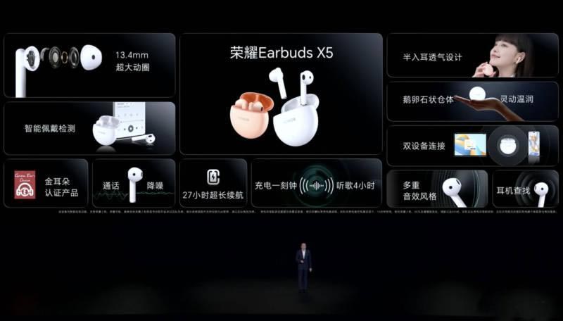 發布會上,榮耀還帶了一款Earbuds X5耳機新品,采用了鵝卵石狀倉體,提供釉白色和珊瑚粉兩款配色。耳機采用了半入耳設計,單只僅重3.8g,帶來空氣感舒適佩戴體驗。Earbuds X5采用了13.4mm動圈單元,復合鍍鈦振膜,呈現純正音質,并通過金耳朵產品認證。Earbuds X5提供了27小時超長續航,充電一刻鐘,可以支持4小時聽歌體驗。